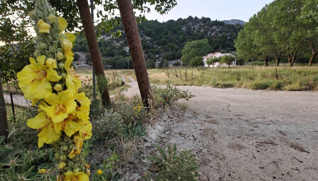 Jälkimmäisenä iltana nautimme porsaan ja lampaan kyljyksiä, perunoita ja mehukkaita kurkkuja sekä tomaatteja. Niiden päälle keittiön naiskokit olivat lisänneet glistrídaa (γλιστρίδα), joka on Omaloksen ylängön kaltaisilla alueilla luonnonvaraisesti kasvava yrtti. Mikä makujen sinfonia meitä kohtasi molemmilla illallisilla, ja jälkiruokana tarjoiltiin talon puolesta vesimelonia ja tsikoudiaa (τσικουδιά) tai jäätelöä. Hyvä ruoka sai meidät kylläisiksi ja oli ihana pujahtaa viileään huoneeseen nukkumaan.